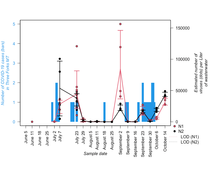 Three Forks, MT: The figure above shows the number of confirmed COVID-19 cases (left axis) and estimated SARS-CoV2 levels in wastewater (right axis) in the town of West Yellowstone, MT over time. Weekly wastewater testing was initiated on June 6, 2020 and is still in progress. COVID-19 cases (bars) refer to laboratory confirmed cases as reported by the Gallatin City/County Health Department since the onset of patient testing in March 2020. SARS-CoV2 results (dots) shown for nucleocapsid gene targets 1 and 2 (N1 and N2) represent the median of 2-3 replicate samples on each date (error bars = 95% confidence limits; some dots completely cover error bars). LOD = limit of detection