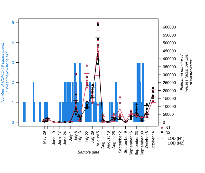 West Yellowstone, MT: The figure above shows the number of confirmed COVID-19 cases (left axis) and estimated SARS-CoV2 levels in wastewater (right axis) in the town of West Yellowstone, MT over time. Weekly wastewater testing was initiated on May 28, 2020 and is still in progress (graph will be updated weekly). COVID-19 cases (bars) refer to laboratory confirmed cases as reported by the Gallatin City/County Health Department since the onset of patient testing in March 2020. SARS-CoV2 results (dots) shown for nucleocapsid gene targets 1 and 2 (N1 and N2) represent the median of 2-3 replicate samples on each date (error bars = 95% confidence limits; some dots completely cover error bars). LOD = limit of detection
